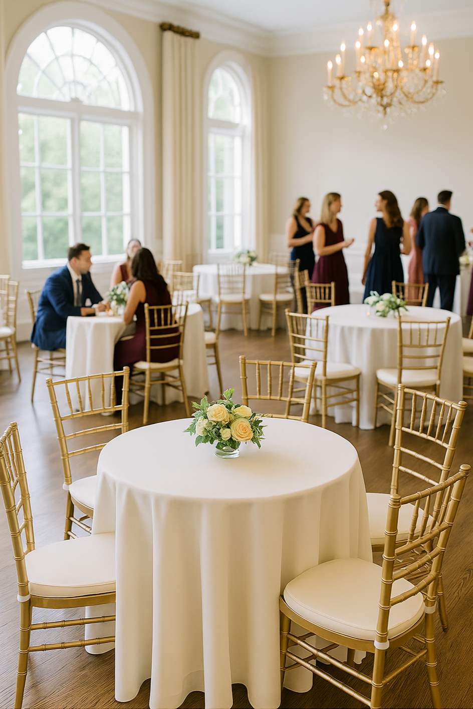 Our 36” round cafe tables are the perfect choice for dining-height seating at weddings, parties, and corporate events across Atlanta. Compact yet elegant, these tables comfortably seat two to four guests, making them ideal for small-group dining or intimate lounge areas.