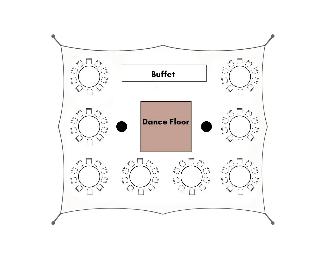 Below is a sample layout to help you visualize what’s possible with a Classic Pole Tent. Every event is different, so we’ll help you customize the perfect setup once you submit your wishlist.
